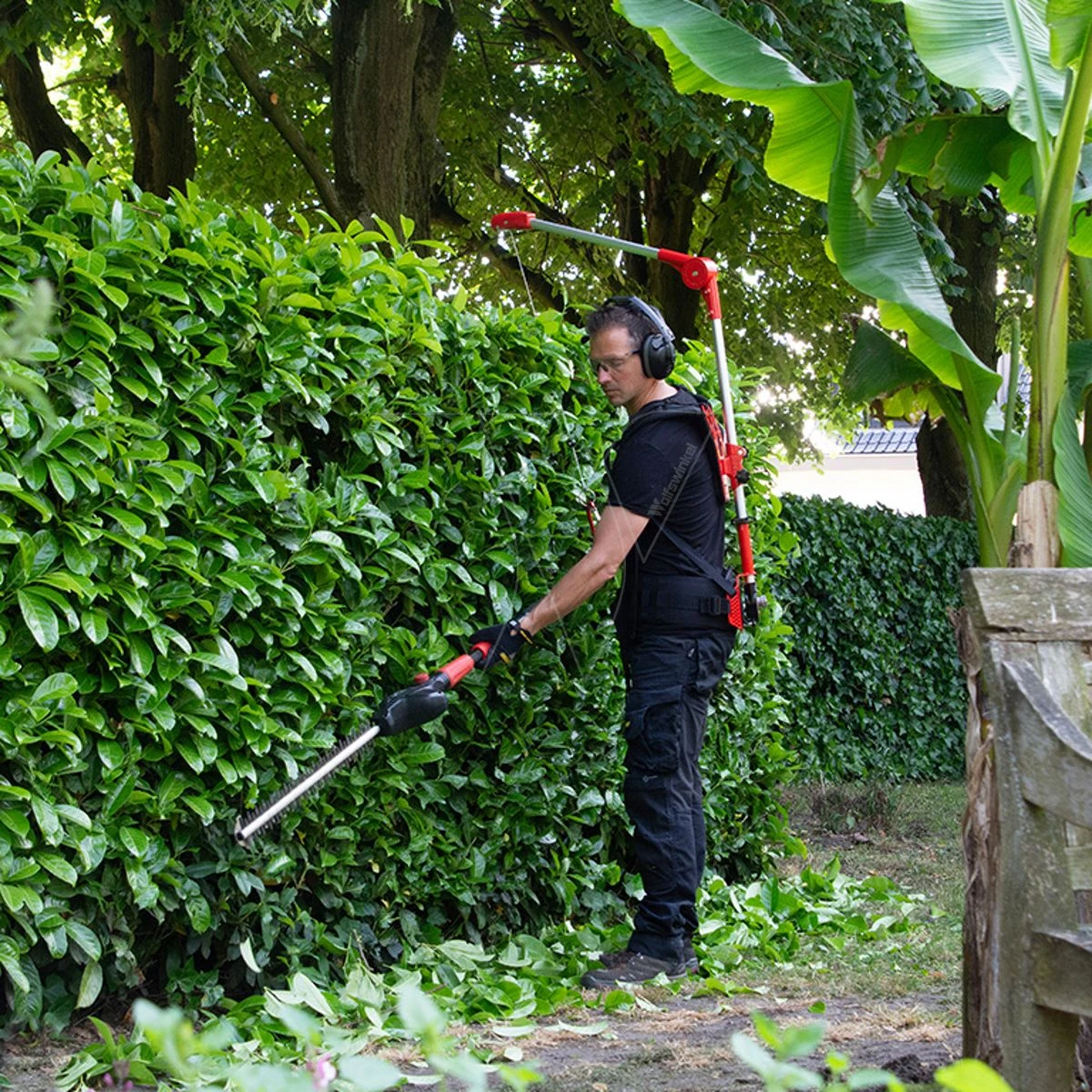 Het comfortabele harnas met verstelbare schouderbanden wordt als een rugzak gedragen. Je koppelt je heggenschaar (of ander draagbaar tuingereedschap tussen de 4,5 en 8 kg) aan de staalkabel van de katrol, die het gewicht van de schaar verplaatst naar het harnas. De kabel beweegt soepel langs gelagerde rollen in de verstelbare buis. Zo helpt de ET je de hele dag lang met heggen scheren. En omdat het minder inspannend is, werk je ook nog sneller en veiliger.