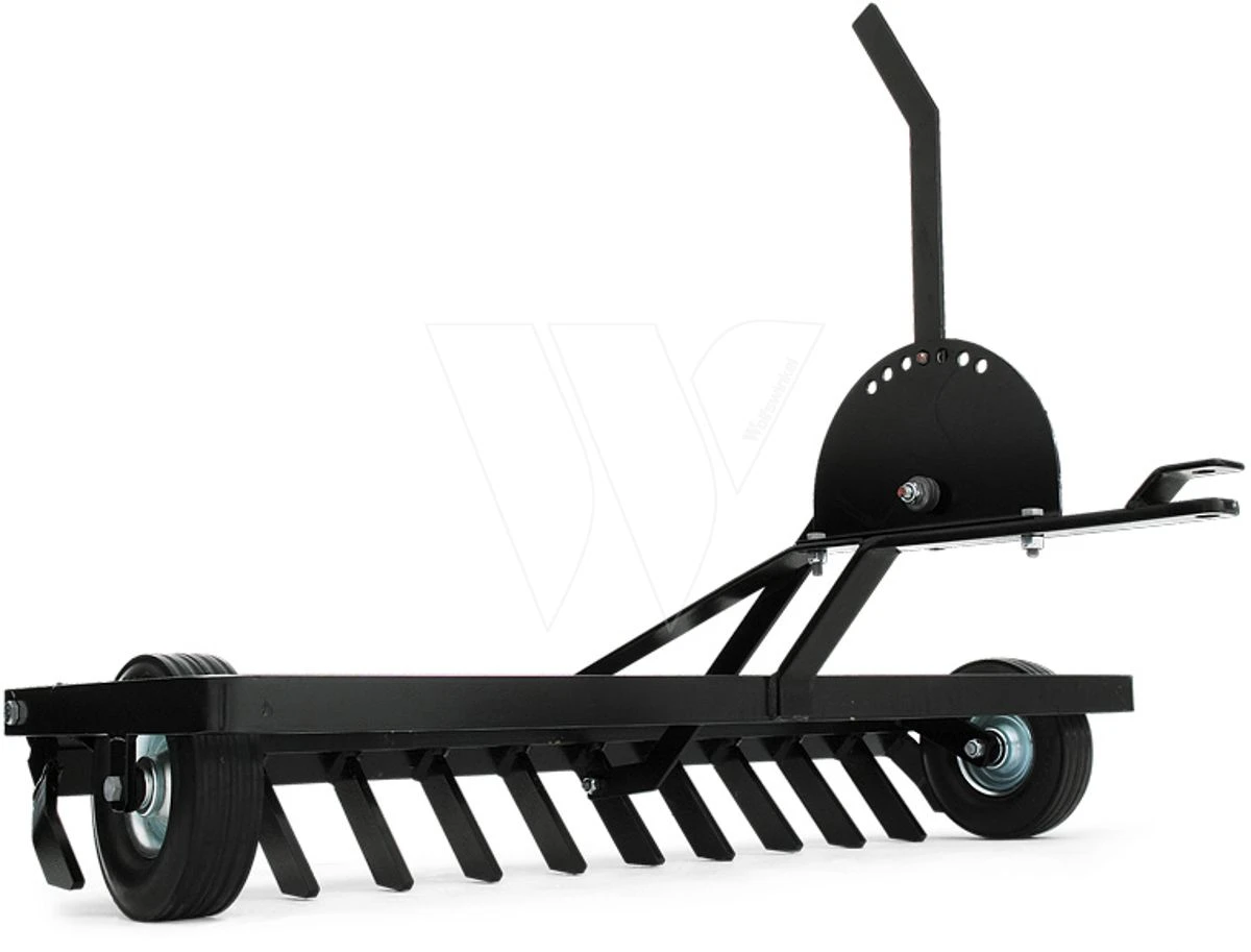 Een robuuste hark met praktische rubberen wielen en verstelbare diepte. Heeft gebogen pennen die meebuigen wanneer u achteruit rijdt.